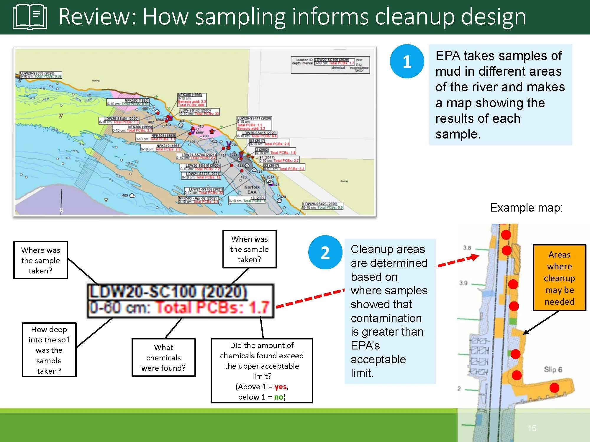 A slide I designed for EPA to explain in plain English how the results of chemical sampling in the river are represented in the cleanup plans and how the results inform the map of designated cleanup areas.